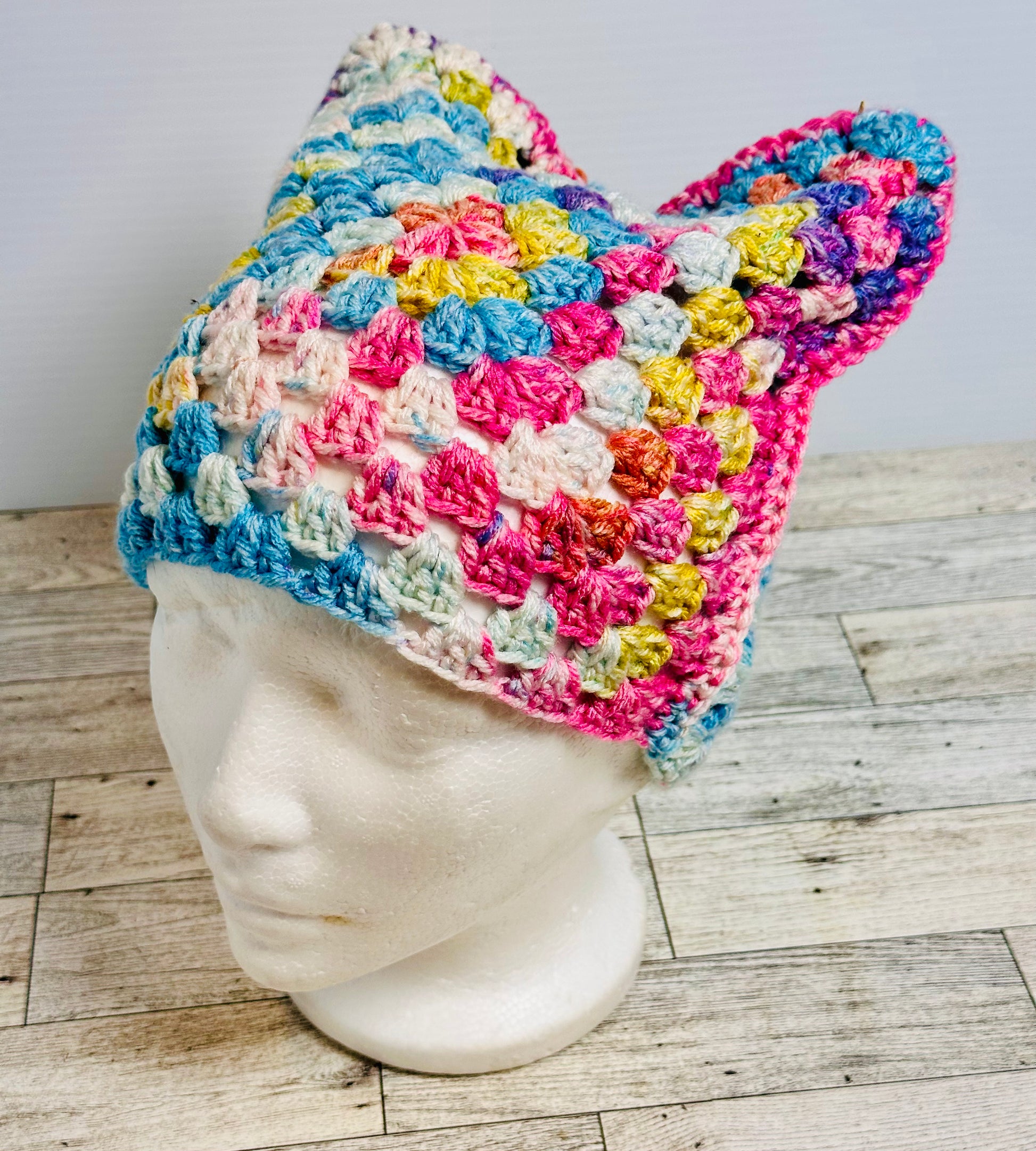 Add a playful pop of color to your outfit with this handmade Bubblegum Dreams Cat Ear Beanie. Crocheted with soft acrylic yarn in vibrant pastel shades, this beanie features classic granny squares and adorable structured cat ears for the perfect cute + cozy look. Each beanie is handmade, so every piece is truly one-of-a-kind and may vary slightly from the photos.